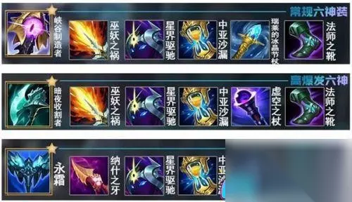 副系和小符文都可以根据自己的对线情况进行灵活地调整,如鞋子+饼干、骸骨+复苏等~ 装备推荐 出门装一般选择多兰戒+两瓶红药水,追求极致的对线也可以选择腐败药水出门; 神话装备有多种选择、当下常见的选择有:追求伤害和持续输出的峡谷制造者、追求爆发伤害的暗夜收割者、追求控制和坦度的永霜、面对菜刀队时的冰拳等; 其他的则可以选择巫妖、纳什、中亚、冰杖、恶魔之拥、星界驱驰、法穿棒、女妖、绿甲等; 鞋子则是选择法穿鞋或者其他抗性鞋; 下面给大家几套出装供参考: 峡谷制造者、巫妖、星界驱驰、中亚、冰杖、法穿鞋 (或抗性鞋) 暗夜收割者、巫妖、星界驱驰、中亚、法穿棒、法穿鞋(或抗性鞋) 永霜、纳什、星界驱驰、中亚、女妖、法穿鞋(或抗性鞋) 冰拳、纳什、中亚、恶魔之拥、绿甲、法穿鞋(或抗性鞋)