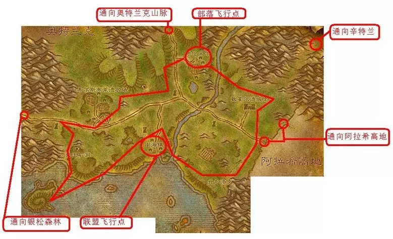 这篇内容为魔兽世界玩家解析希尔斯布莱德丘陵的前往路线,从莫高雷出发,经贫瘠之地、杜隆塔尔到奥格瑞玛,坐飞艇到提瑞斯法林地,再经银松森林即可抵达,还附上了该区域的地图,标注了飞行点及连通区域。