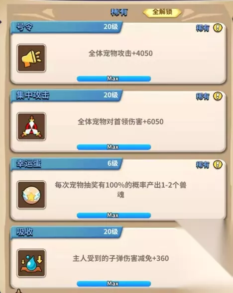 稀有魂技一共四个:号令,集中攻击,幸运蛋,吸收。 【稀有平均升到58级,解锁全部史诗】