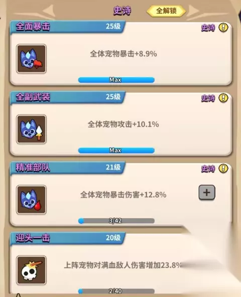 史诗魂技一共四个:全面暴击,全副武装,精准部队,迎头一击。 史诗平均升到90级,解锁全部传奇