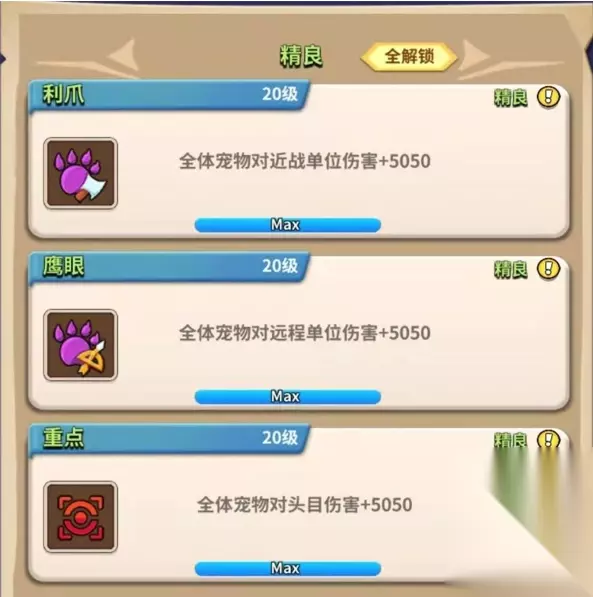 精良魂技一共三个:利爪,鹰眼,重点。 【精良平均升级到50级,解锁全部稀有】
