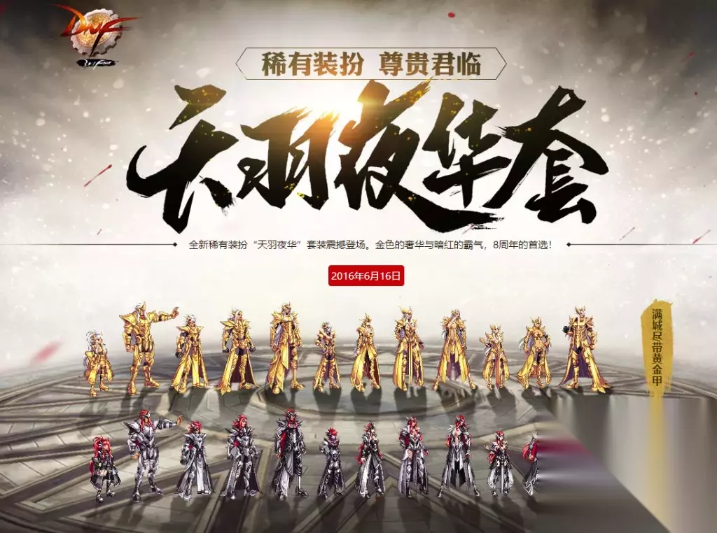 天华九夜:夜华羽翼套 此套装,不分职业一致采用相同的黑金色调,展现出一种豪华霸气之风范。无论是女鬼还是男格斗者,均显得格外出众。去年国庆亦有其追忆,今后恐不再出。