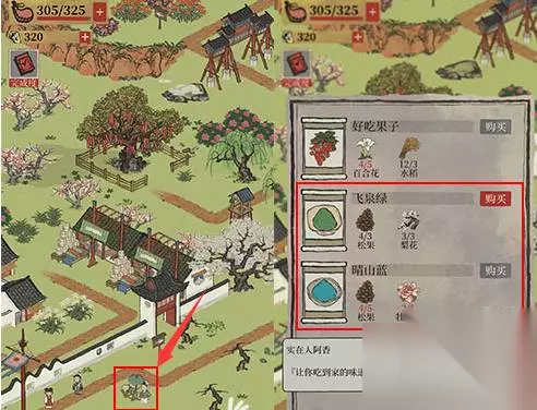 方法二:应天府探索-丽娘府宅-早点摊 1、点击早点摊就可以使用3个松果,3个梨花兑换到飞泉绿了 2、这个图获取飞泉绿的材料比较简单,推荐来这个图获取