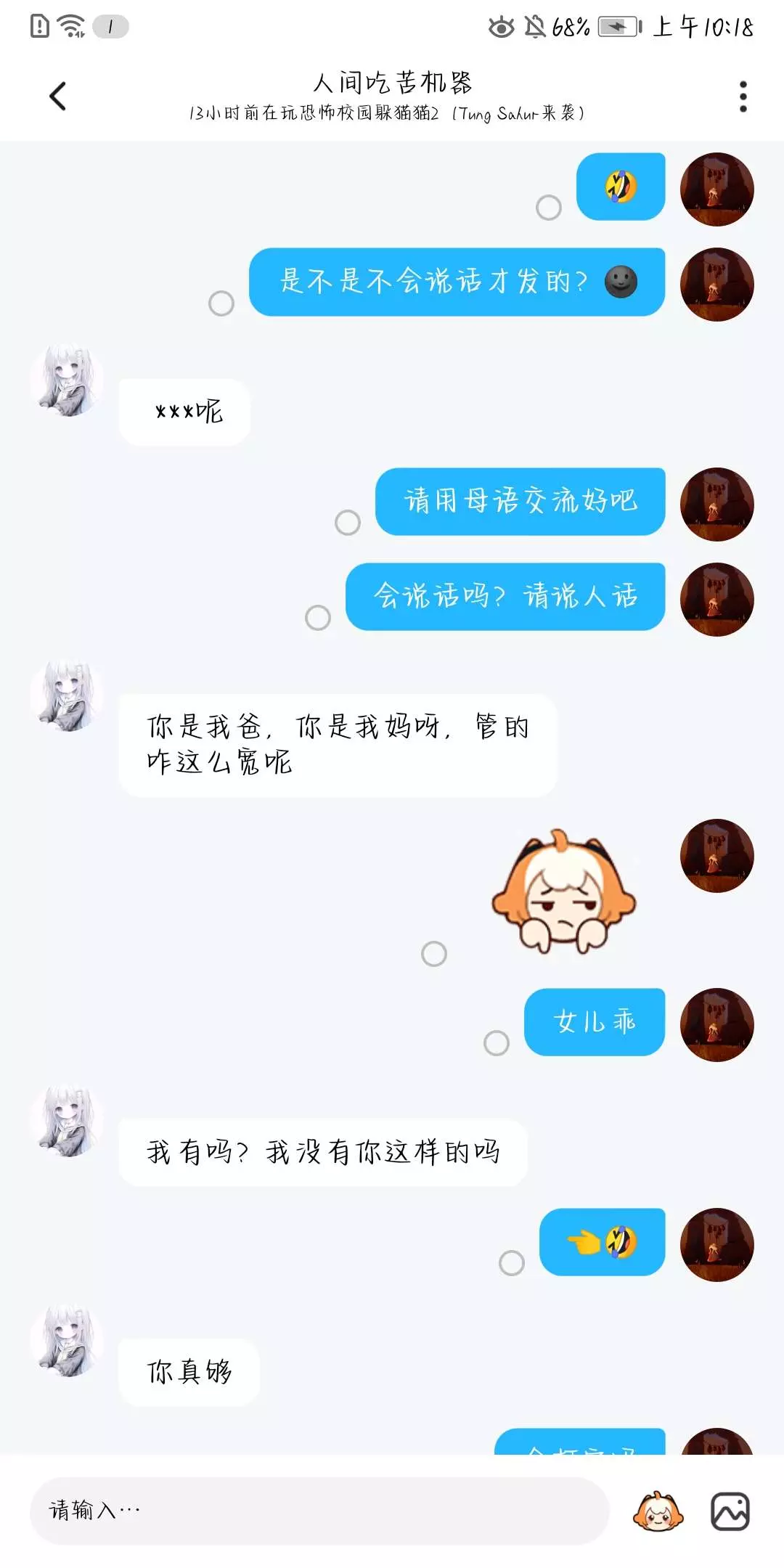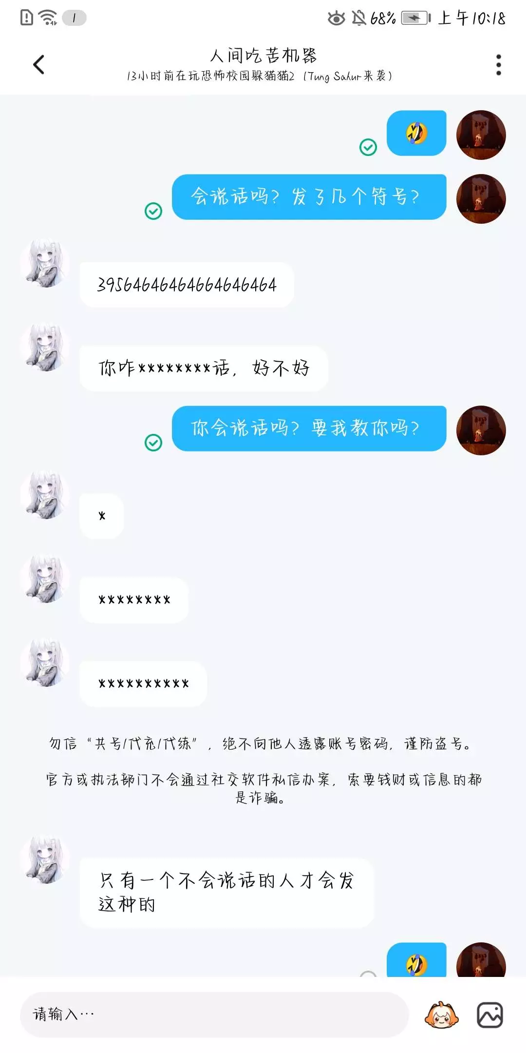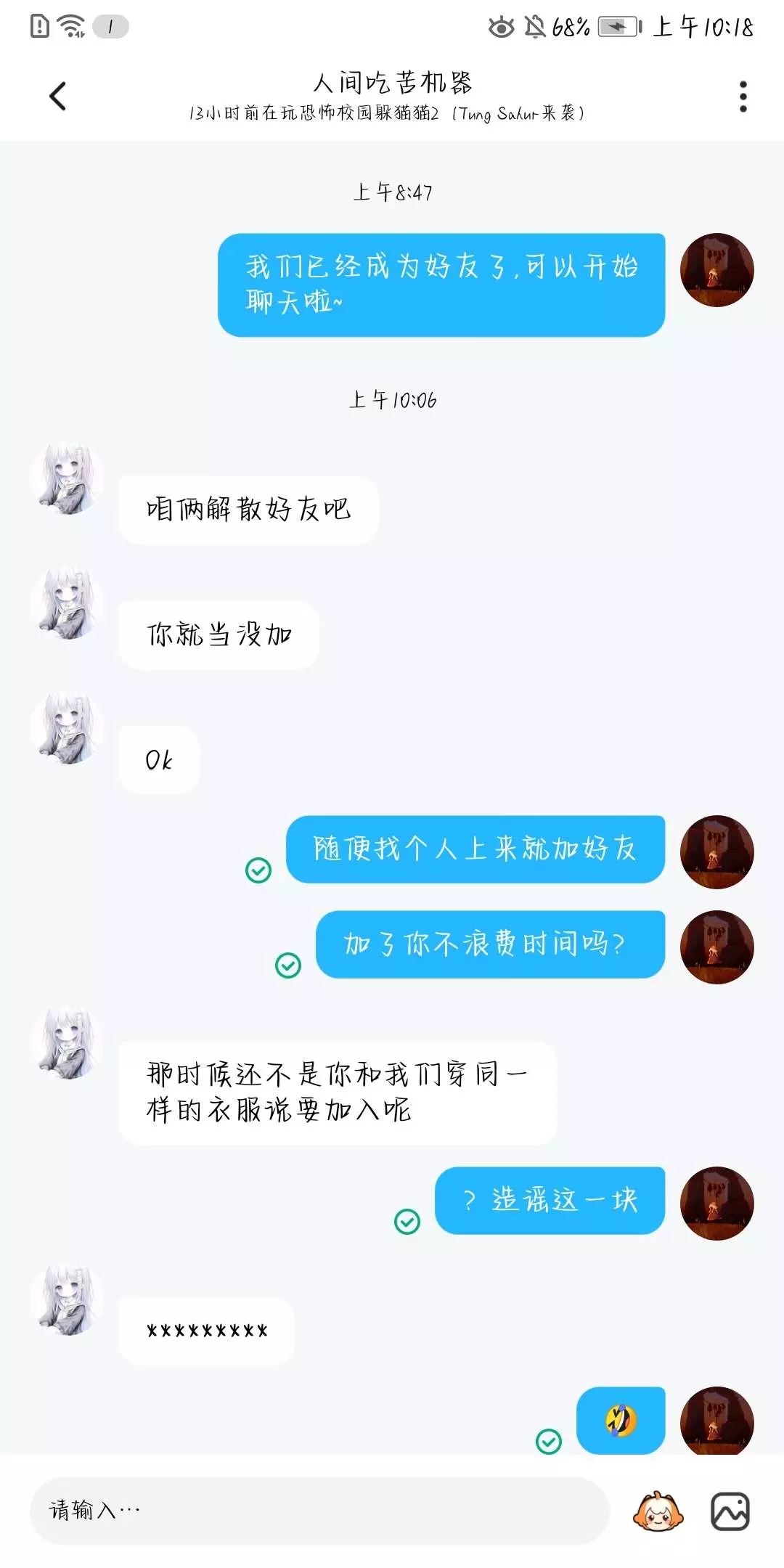 不是吧,这个人一上来就加我好友,后面我们一起玩游戏,他被捉捕者打了,他就一直发哭的表情,还说姐姐为什么打我呀?为什么?还命令所有人聚在她那。她被追捕者打倒地后,命令别人来救他,游戏结束后还质问别人为什么不救她