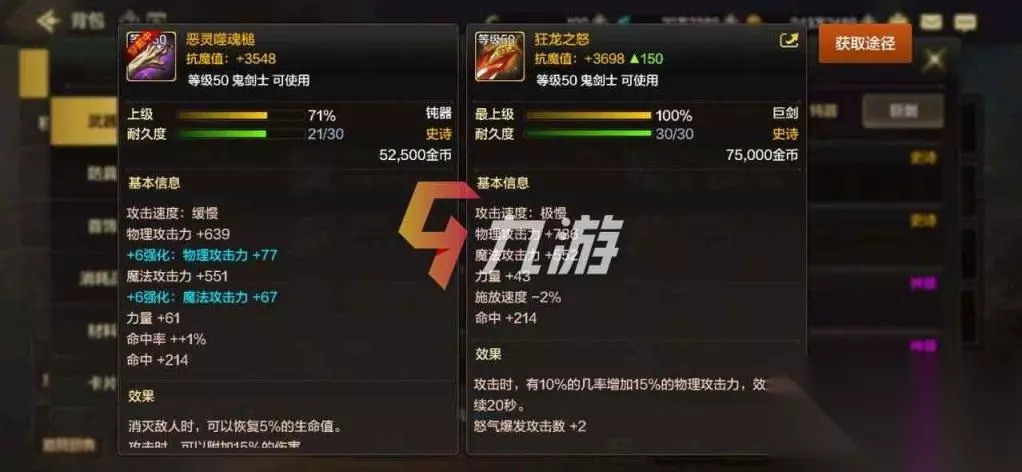 子午七星剑这把武器在端游的名气也是相当之高,不过手游对其属性进行了调整。攻击时有概率减少敌人500点防御力以及30%的攻击力。简单粗暴的伤害加成在前期小伙伴们如果早早刷到的花依然可以作为主力装备打造,毕竟沧海系列的武器全靠脸。如果后期手游出现了战斗切换装备的玩法,这把武器的热门程度将会更高。根据剑魂的技能特性,官方还是会有大概率在后期提供武器切换的功能。 ——————【狂龙之怒】—————— 【伤害加成】:TOP3 【推荐值】:4星 【获得方式】:深渊掉落/史诗制作