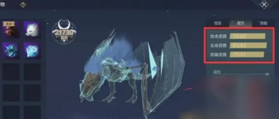妄想山海宠物资质上限怎么提升 提升方法: 1、首先在游戏中宠物的资质分为攻击资质,生命资质与防御资质这三种,资质决定了属性的上限,满资质的宠物和普通宠物之间属性的差距还是很大的。 2、目前提高资质的方法只有给宠物喂食化育丹,每次进行喂食之后都会随增加3种资质中的一项,化育丹可以直接在商城中进行购买。 宠物属性的上限由宠物的资质决定 分别是攻击资质,生命资质与防御资质 同样是48级的骨龙,可以发现宠物的攻击,生命和防御都有大幅度提高,就是因为资质提高了。