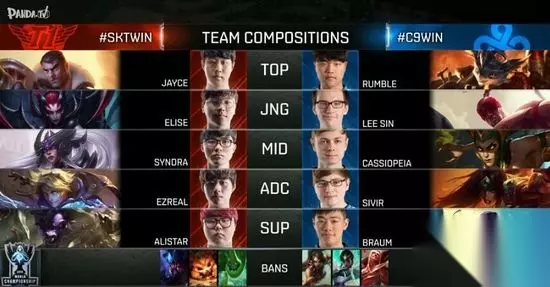 BP方面,SKT封锁了Meteos的挖掘机后,C9也是Ban掉了卡尔玛和吸血鬼还以颜色。而选人方面,SKT表现得相当自信。在C9拿出了布隆辅助后,依旧选到了杰斯和EZ这样的Poke英雄。不过C9这边是有能够化腐朽为神奇的英雄圣僧,谁输谁赢依旧不好说。