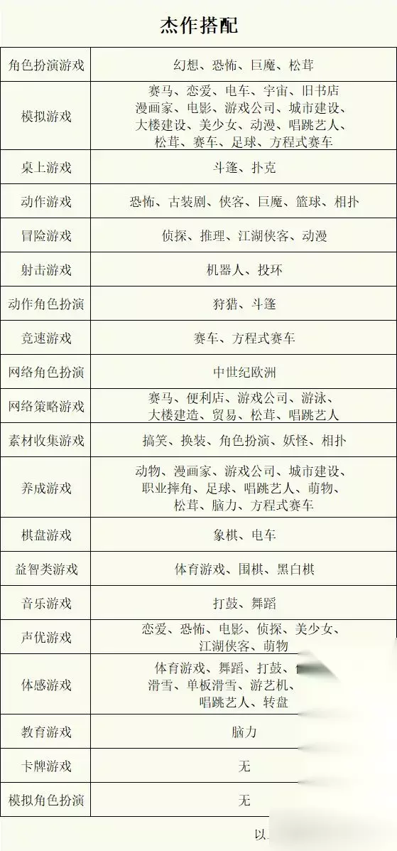 游戏开发物语中最佳杰作类型有角色扮演游戏、模拟游戏、桌上游戏、动作游戏、冒险游戏、射击游戏、动作角色扮演、竞速游戏、网络角色扮演、网络策略游戏、素材收集游戏、养成游戏、棋盘游戏、益智类游戏、音乐游戏、声优游戏、体感游戏、教育游戏、卡牌游戏、模拟角色扮演,每个不同的类型都有相应的搭配方案,下面是为大家整理的详细杰作搭配内容方案! 游戏开发物语最佳杰作搭配方案 1、角色扮演游戏:幻想、恐怖、巨魔、松茸 2、模拟游戏:赛马、恋爱、电车、宇宙、旧书店、漫画家、电影、游戏公司、城市建设、大楼建设、美少女、动漫、唱跳艺人、松茸、赛车、足球、方程式赛车 3、桌上游戏:斗篷、扑克 4、动作游戏:恐怖、古装剧、侠客、巨魔、篮球、相扑 5、冒险游戏:侦探、推理、江湖侠客、动漫 6、射击游戏:机器人、投环 7、动作角色扮演:狩猎、斗篷 8、竞速游戏:赛车、方程式赛车 9、网络角色扮演:中世纪欧洲 10、网络策略游戏:赛马、便利店、游戏公司、游泳、大楼建造、贸易、松茸、唱跳艺人 11、素材收集游戏:搞笑、换装、角色扮演、妖怪、相扑 12、养成游戏:动物、漫画家、游戏公司、城市建设、职业摔角、足球、唱跳艺人、萌物、松茸、脑力、方程式赛车 13、棋盘游戏:象棋、电车 14、益智类游戏:体育游戏、围棋、黑白棋 15、音乐游戏:打鼓、舞蹈 16、声优游戏:恋爱、恐怖、电影、侦探、美少女、江湖侠客、萌物 17、体感游戏:体育游戏、舞蹈、打鼓、健美、滑雪、单板滑雪、游艺机、排球、唱跳艺人、转盘 18、教育游戏:脑力 19、卡牌游戏:无 20、模拟角色扮演:无