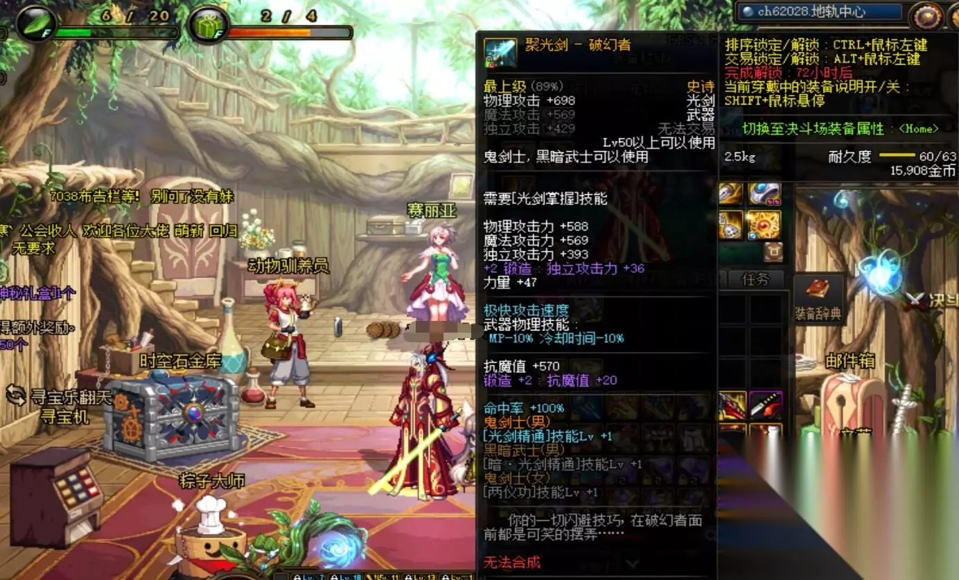 这把武器叫做聚光剑-破幻者,老玩家对它应该都会有印象,正如它武器属性所写的那样,戴上后能直接给角色带来100%的命中率加成。看到只加命中率很多玩家会觉得属性很一般,然而可千万别小看这100%命中率加成。在60版本时期命中率是很重要的一项属性,因为那是勇士或王者级以上的怪物都有大量闪避,没有命中伤害再高也是MISS。