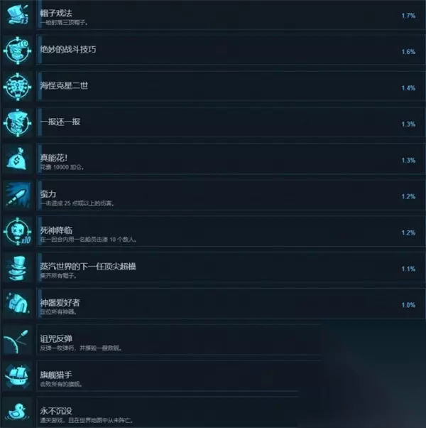 蛮力 一击造成 25 点或以上的伤害。 死神降临 在一回合内用一名船员击溃 10 个敌人。 蒸汽世界的下一任顶尖超模 集齐所有帽子。 神器爱好者 定位所有神器。 诅咒反弹 反弹一枚弹药,并摧毁一艘敌舰。 旗舰猎手 击败所有的旗舰。 永不沉没 通关游戏,且在世界地图中从未阵亡。 点灯熬油 在单日内完成四项任务。