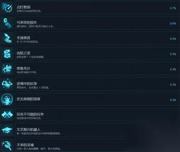 可承受的损失 通关游戏,且阵亡船员不超过 4 名。 全速前进 在 35 天内完成游戏。 齿轮之美 获取全部 7 个齿轮类装置。 准备充分 完成所有船只升级。