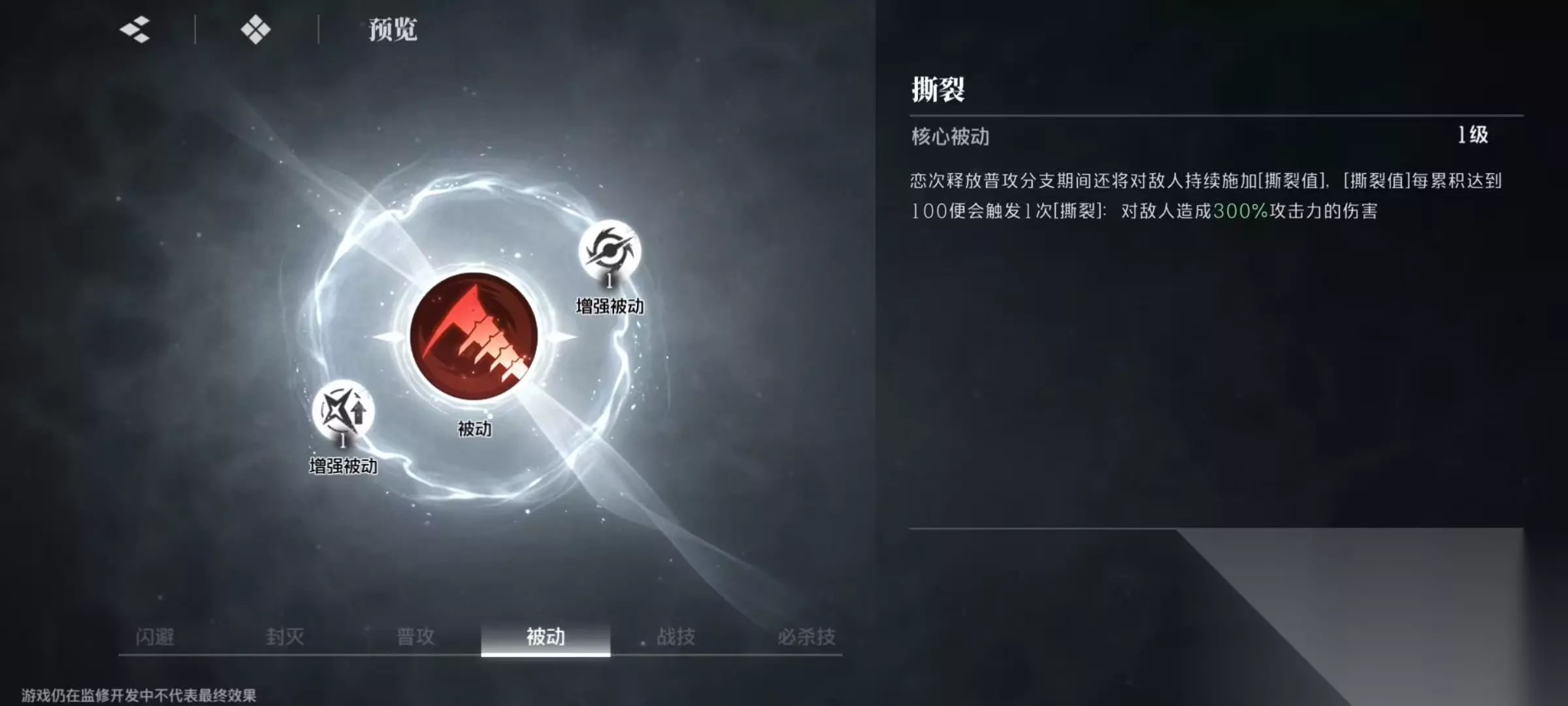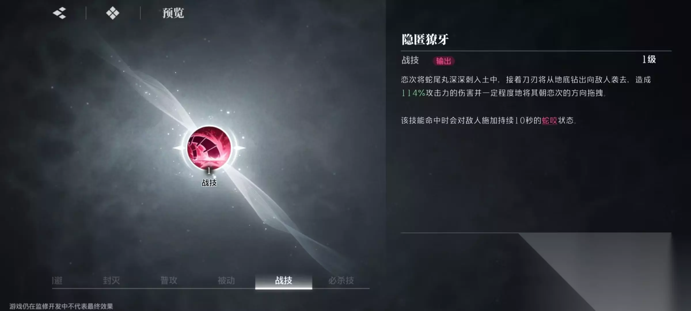 因为是紫色品质,所以只有一个核心被动和两个增强被动。核心被动撕裂,释放普攻分支期间,对敌人施加持续的撕裂值,积累100点撕裂值就可以触发一次撕裂造成伤害。在增强被动的影响下,撕裂造成伤害提升,每次对敌人施加撕裂值速率提升。战记隐匿獠牙,将蛇尾丸刺入土中,刀刃从地底钻出向敌人袭去,造成伤害后将目标朝阿散井恋次方向拖拽。技能命中时会对敌人施加持续十秒的蛇咬状态。