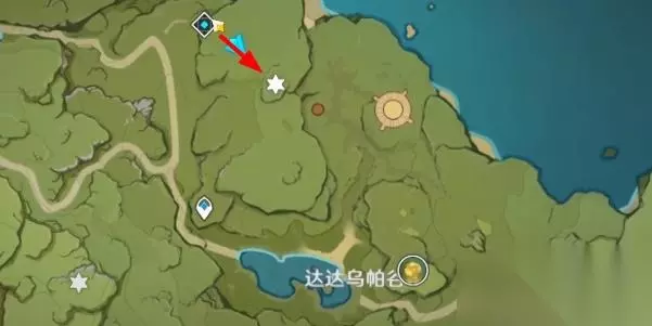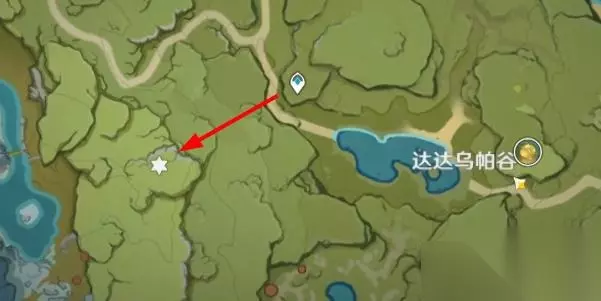 第四处:达达乌帕谷传动点西南方向; 1、我们在达达乌帕谷下图传送点位置,朝着对面的岩壁飞过去,然后爬到顶部朝着偏左一点的方向移动。