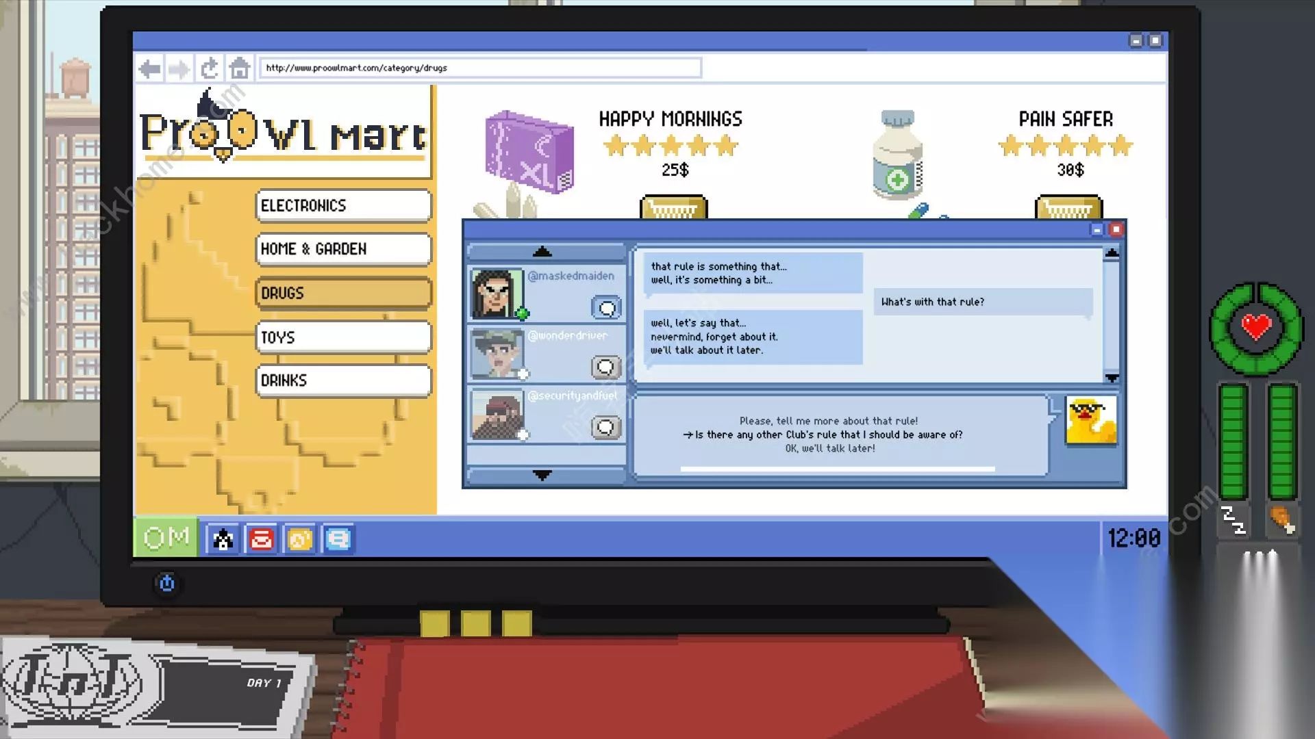 其他杂项事件:1、法老面具猴子协会会问你法老面具展览举办人的电话。另外给这个人打电话没有任何用处。他很忙懒得搭理你。面具会在某个时间点眼睛变成歪的....这个是一个谜。也许盯着它一直看能发现真相....2、麦田协会会问你这个麦田在哪。有时麦田上会有古式火车经过,点击火车和风车等物可以获得关键词,联合搜索可以得到这条复古旅游观光铁路的信息,进而查询得出麦田地址。养鸡场、流水线、机场、高速路都没有用。目前版本吃喝睡觉的需求都不怎么关键,钱只要多做协会的70块有奖问答任务是完全不缺的,吃的也花不了多少钱。什么大减价、送外卖、***送草、肥宅骚扰、包租婆收租等等剧情就只是单纯的娱乐,不会产生决定性的影响。