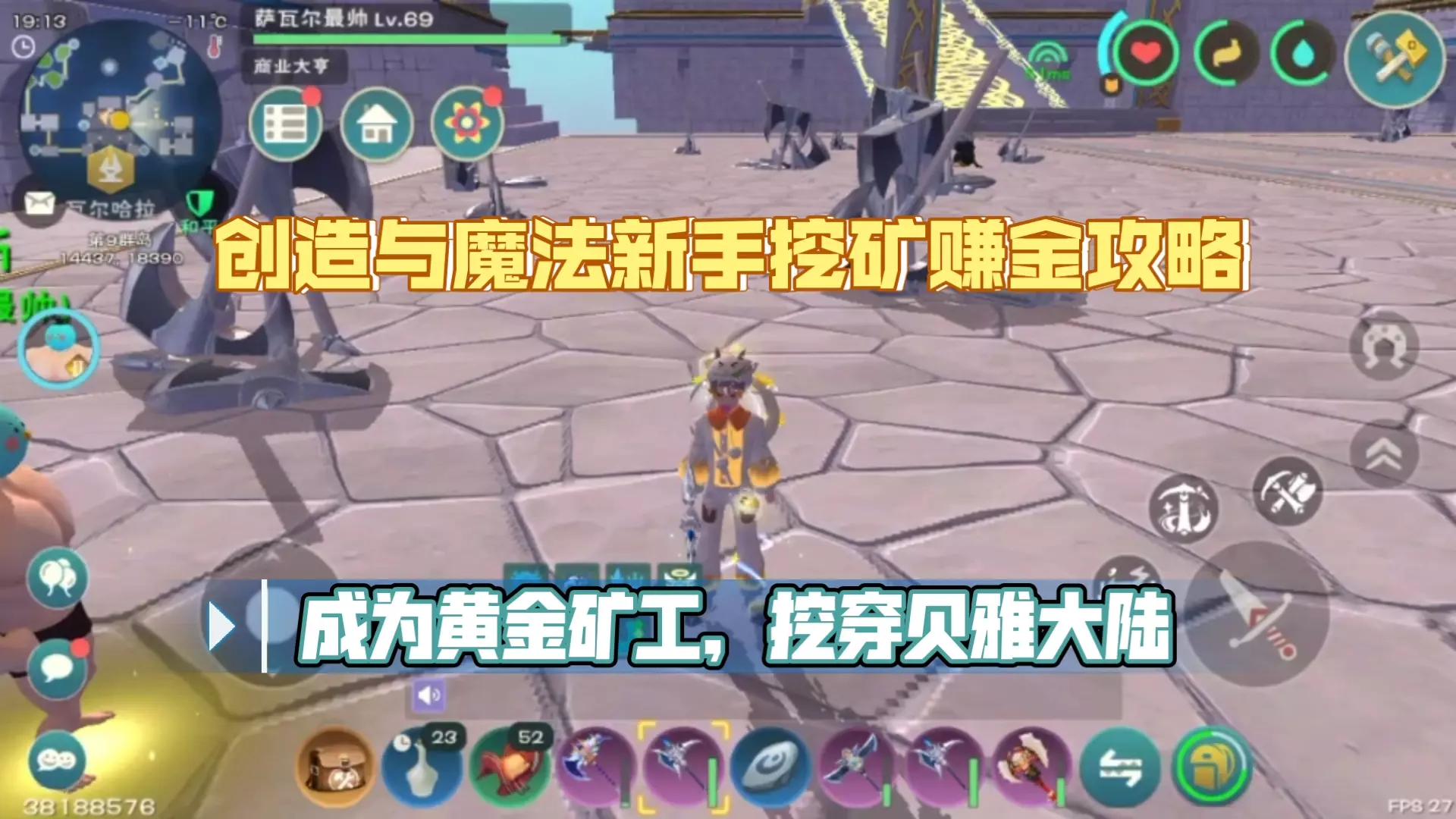 这是《创造与魔法》480服务器的新手新服开荒教学,展示了贝雅大陆的游戏内容,包含砍树、挖矿等升级开荒操作,还提及新服抢物资的情况,附带4399签到礼包福利。