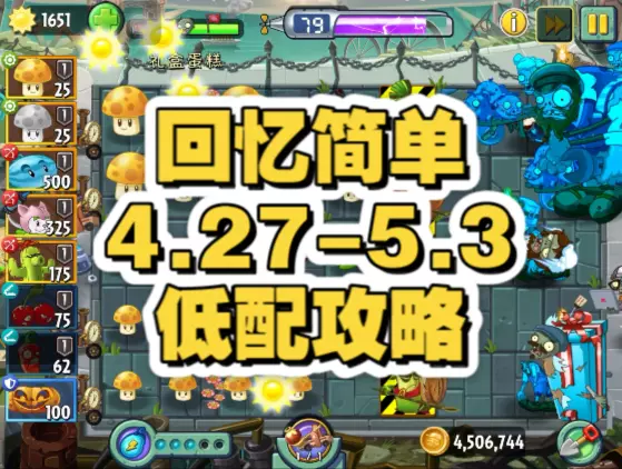 这是《植物大战僵尸2》4.27-5.3回忆之旅简单模式的平民攻略,展示了盲盒水道等关卡的植物布局、挑战目标,还有实战中的僵尸应对、植物搭配,帮助平民玩家通关该模式。