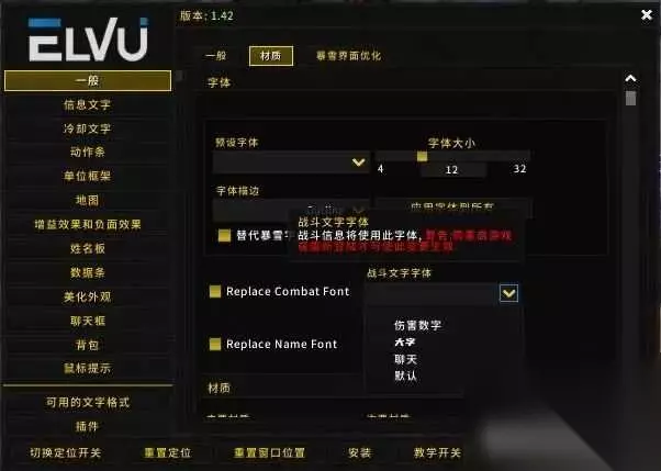 1. 如果是系统原装界面,直接修改ARKai_C.TTF 这个文件2. 如果你是ElvUI,先修改在fonts文件夹里自己复制自己的字体文件,例如BIG.ttf在插件里找到这个文件:D:\World of Warcraft Classic\World of Warcraft\_retial_\Interface\AddOns\ElvUI\Libraries\LibSharedMedia-3.0\LibSharedMedia-3.0.lua elseif locale == "zhCN" then LOCALE_MASK = lib.LOCALE_BIT_zhCN -- SML_MT_font["伤害数字"] = [[Fonts\ARKai_C.ttf]] SML_MT_font["默认"] = [[Fonts\ARKai_T.ttf]] SML_MT_font["聊天"] = [[Fonts\ARHei.ttf]] 这是ElvUI默认调用的字体,我们手工自己加上自己需要的字体 elseif locale == "zhCN" then LOCALE_MASK = lib.LOCALE_BIT_zhCN -- SML_MT_font["伤害数字"] = [[Fonts\ARKai_C.ttf]] SML_MT_font["默认"] = [[Fonts\ARKai_T.ttf]] SML_MT_font["聊天"] = [[Fonts\ARHei.ttf]] SML_MT_font["大字"] = [[Fonts\BIG.ttf]] 然后在游戏里,ElvUI设置-一般-材质-replace combat font 选择你的字体,重新载入界面生效/rl