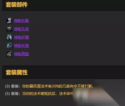盗贼t2.5套装一共有5件,分别是神秘长靴、神秘头盔、神秘护肩、神秘护腿、神秘胸甲。套装的属性是你的暴风雪法术有30%的几率完全不被打断,当你的法术被抵抗后,法术命中率提高5%,持续20秒。