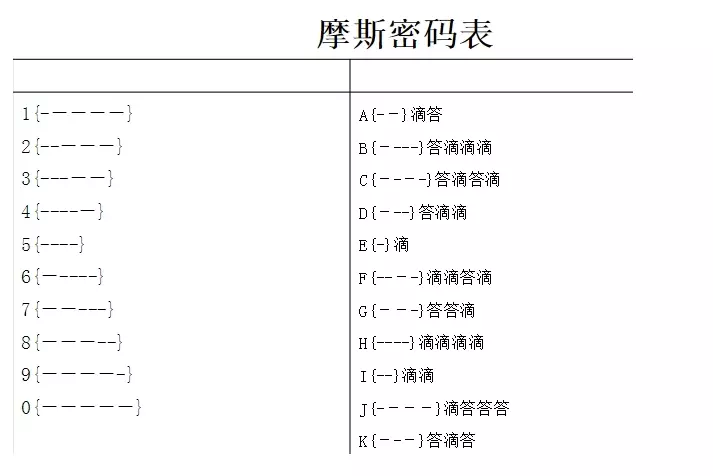 一、摩斯密码表 摩斯密码是由两种基本信号和不同的间隔时间组成的,其中短促的点信号" ."读“滴”,保持一定时间的长信号"—"读作“答”。 1、一点为一基本信号单位,一划的长度=3点的长度。 2、在一个字母或数字内,各点、划之间的间隔应为两点的长度。 3、字母(数字)与字母(数字)之间的间隔为7点的长度。