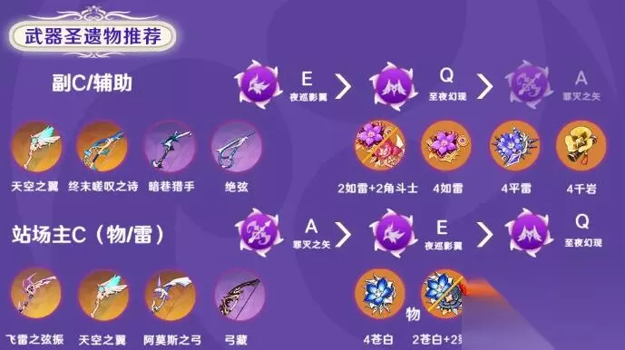 圣遗物搭配: 副C/辅助:2如雷+2角斗士、4如雷、4平雷、4千岩 站场主C:4苍白、2苍白+2染血、2如雷+2角斗士、4如雷 原神菲谢尔武器搭配 武器: 副C/辅助:天空之翼+终末嗟叹之诗+暗巷猎手+绝弦 站场主C:飞雷之弦振+天空之翼+阿莫斯之弓+弓藏