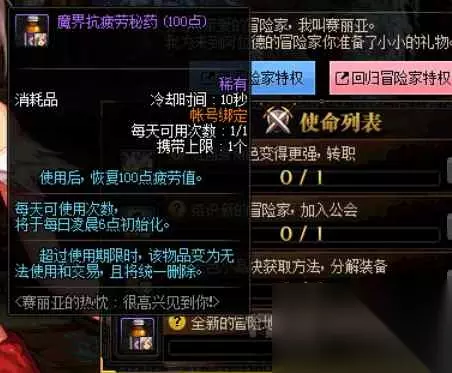 完成埃尔文防线任务进入赫顿玛尔后可以获得一瓶100的疲劳药,不过也是30天期限~不过足够大多数小伙伴升级到满级然后刷深渊用掉了,当然如果是死土豪的话可能一天满级就用了emmm
