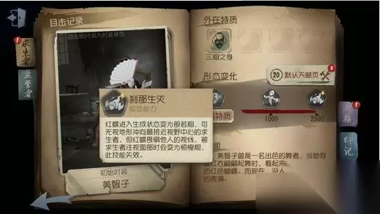 红蝶是个和风的人物,它曾是个优秀的舞者。身着一袭红衣起舞的它,就像是要飞走的蝴蝶。到了庄园之中却没人敢直视它的舞蹈,因此它被叫做红蝶。大家最熟悉它的应该是它的技能,不能给人带来什么伤害,但是能追人。在刚开局的时候就能用,而且它的冲刺是很快的。它的冷却也不怎么费时,只需要八秒又能够重新用,同时也没有地形的限制。这就是说它不会去做什么板窗之类的,而是在看到人之后可以直接用自己的技能冲过来,这就给它省了很多的时间。另外大家还要知道,红蝶的形象是有三种的。在选好了人物之后它是默认美人相的,用这个形象的话它就是行动快另外还有比较小的竞技范围。因此在人没注意的时候,它可以直接用技能一下子来到人身边。但更多的时候在场上,它都是般若相的。但在翻窗户和柜子的时候,它是不会用这种相的。并且在做其他的行动的之后,它还会变身。它在换形态的时候是不会变的,但在用般若和惊惶时有点不好的作用。比如说警戒的区域要大一些,并且行动也更慢一点。想要玩好它的话,首先就是要用好技能。因为它的刀是比较窄的,所以在砍人的时候不太准。因此最好是用刹那生灭去一下子靠近人,然后再迅速击中它。在场上的时候就是要多用这招。