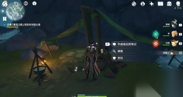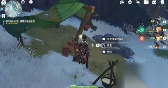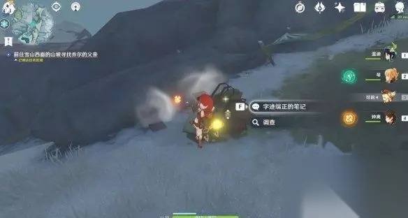 ▲到达第二处营地的路线 在到达任务区域后,我们可以看到雪堆下隐约露出堆积着的行李,通过火元素攻击融化掉雪堆后(普通雪堆,不需要深赤之石buff),同样是一本字迹端正的笔记。这里就是乔尔父亲探索过程中支起的第二处营地了,同时我们还可以了解到,他打算要冲击山顶,于是我们又在应急食品的建议下,继续前往山顶寻找线索。