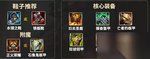 1、日炎是蒙多的核心肉装,这件装备可以让蒙多在场上的时候,每秒对周围的敌人持续的造成伤害。 2、振奋盔甲蒙多的核心回复装备,可以提升蒙多的大招回血效果,提升大招回复效果的30%,对蒙多来说是很大的提升,而且这件装备还附带魔抗和生命值加成。 3、后续装备为亡者的板甲和狂徒铠甲,板甲可以增加血量和护甲值以及少量移速提高生存能力。被动可以提高移速并且对敌方造成魔法伤害。狂徒铠甲能够提供大量生命值和生命恢复,极大的提升了蒙多的生存能力。 4、最后出复活甲或者反甲复活甲提高容错率,反甲能为蒙多提供护甲和生命值,还能在蒙多受到伤害时反弹伤害和造成重伤效果。 5、作为一个需要抗性的英雄,铁板靴和水银之靴是鞋子的最优选择,能帮助蒙多提升相应的抗性。 6、附魔正义荣耀或者石像鬼板甲,正义荣耀提高蒙多的移动速度,被动技能释放一道冲击波,使附近敌方英雄的移动速度降低。追击和开团都能起到很好的作用。石像鬼板甲,提高蒙多的生命值,是前排坦克的首选。