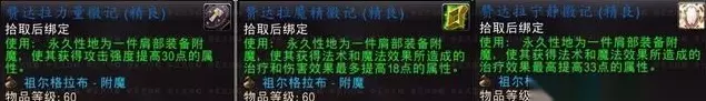 先奉上祖格九大职业的头/腿附魔效果图(全部都是拾取绑定的)。 战士:【力量的证明】 耐力+10, 防御技能+7, 盾牌格挡值+15; 圣骑士:【调和的徽记】 耐力+10 ,防御技能+7, 治疗效果+24; 猎人:【猎鹰的召唤】 耐力+10 ,物理命中+1% ,远程攻击强度+24; 萨满祭司:【巫毒的警觉】 智力+15, 所有魔法伤害和治疗效果+13; 潜行者:【死亡的拥抱】 攻击强度+28, 躲闪几率+1%; 德鲁伊:【灵魂的安抚】 耐力+10,智力+10,治疗效果+24; 法师:【魔法的视域 】法术命中+1% ,法伤效果+18; 牧师:【预言的光环】 耐力+10,每5秒回4点法力值,治疗效果+24; 术士:【不详的妖术 】耐力+10, 所有法伤效果+18。 二、祖格的头/腿附魔: 材料:原始哈卡莱神像1个+(本职业)打孔的巫毒娃娃1个。 前提条件:赞达拉部族的声望达到友善。 原始哈卡莱神像:击杀血领主曼多基尔和妖术师金度必定掉落一个(预计是祖格G团拍卖品之一)。 打孔的巫毒娃娃:开厄运骨堆获得。(注意:开骨堆时很可能被控制,建议清了周围的怪) 换取附魔的地点:祖尔格拉布副本中,打完高阶祭司温诺希斯(毒蛇boss)之后,绕过院墙后面去往高阶祭司玛尔里(蜘蛛boss)的路上左边前方有一座高台,登上台阶后看到一个幽灵状态的巨魔——无眠者赞扎。和他对话选择相对应的职业附魔提交材料即可获得。