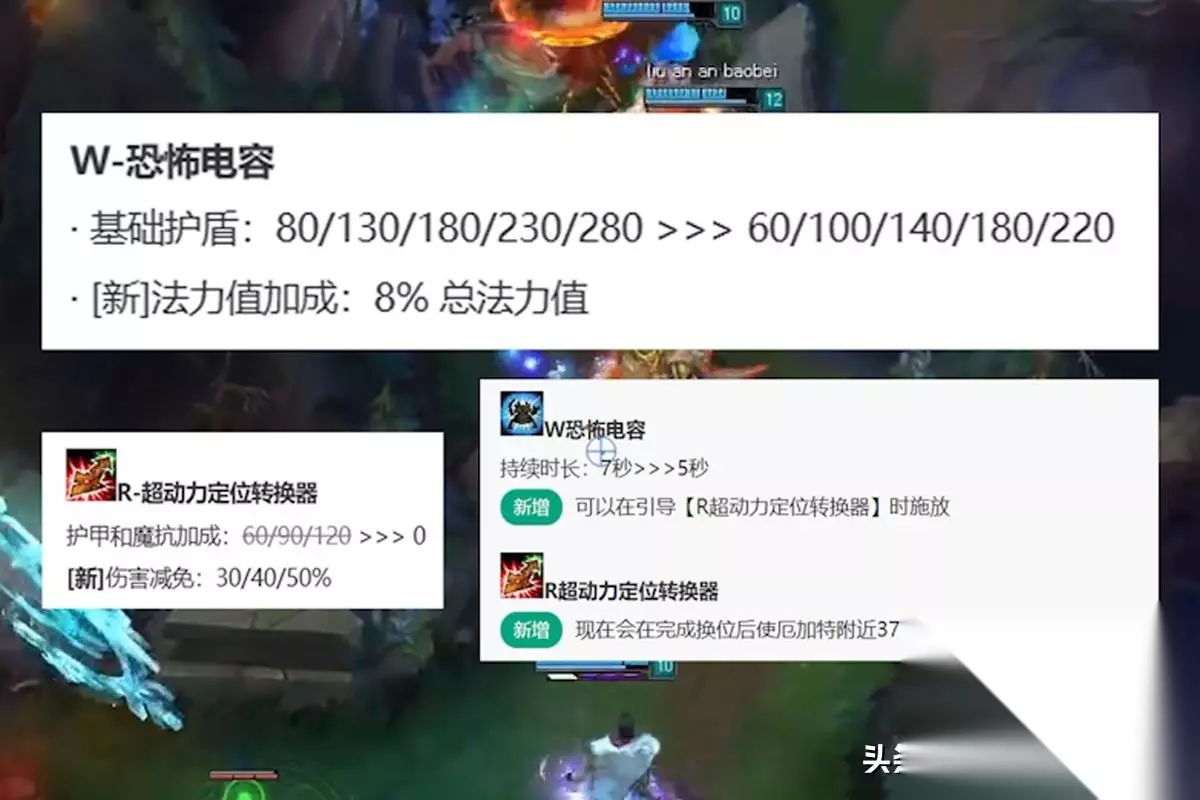 这时候估计有人要反驳我,老版螃蟹没人玩,明明是因为长得丑,我只能说格局小了,一个英雄不管多丑,哪怕模型是坨屎,只要数值够高,就一定会有人用它上分,螃蟹也是如此,从5.5版本开始,它先后获得了几次巨幅加强,包括W护盾和法力值挂钩,大招落地双抗变为减伤,并且新增了恐惧,你猜怎么着?火了!不仅上了世界赛,路人局也出现了一个,非常赖皮的玩法,走中路带惩戒,猎人护符出门,没血了就往F4丢个E,几秒钟回满,而这也是老版螃蟹唯一的高光时刻了。