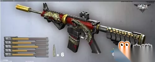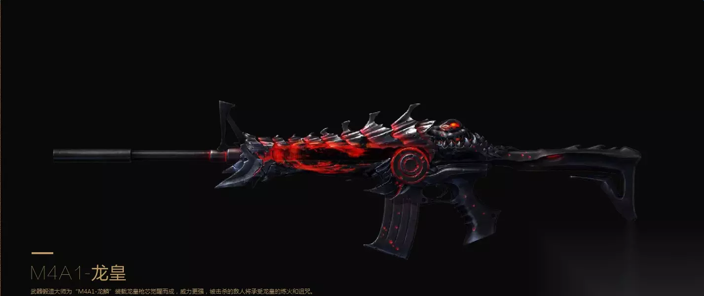 15、M4A1-龙皇 龙鳞的升级版,从道聚城购买龙皇枪芯升级获得!各个枪械的各方面属性都大大提升!外表光效变得更加炫酷。 推荐指数:7