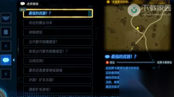 2、打开迷你任务栏,找到并到达此任务的目的地,到达后与恰比对话,了解到最强的武器要使用菜尼尔的角来制作;