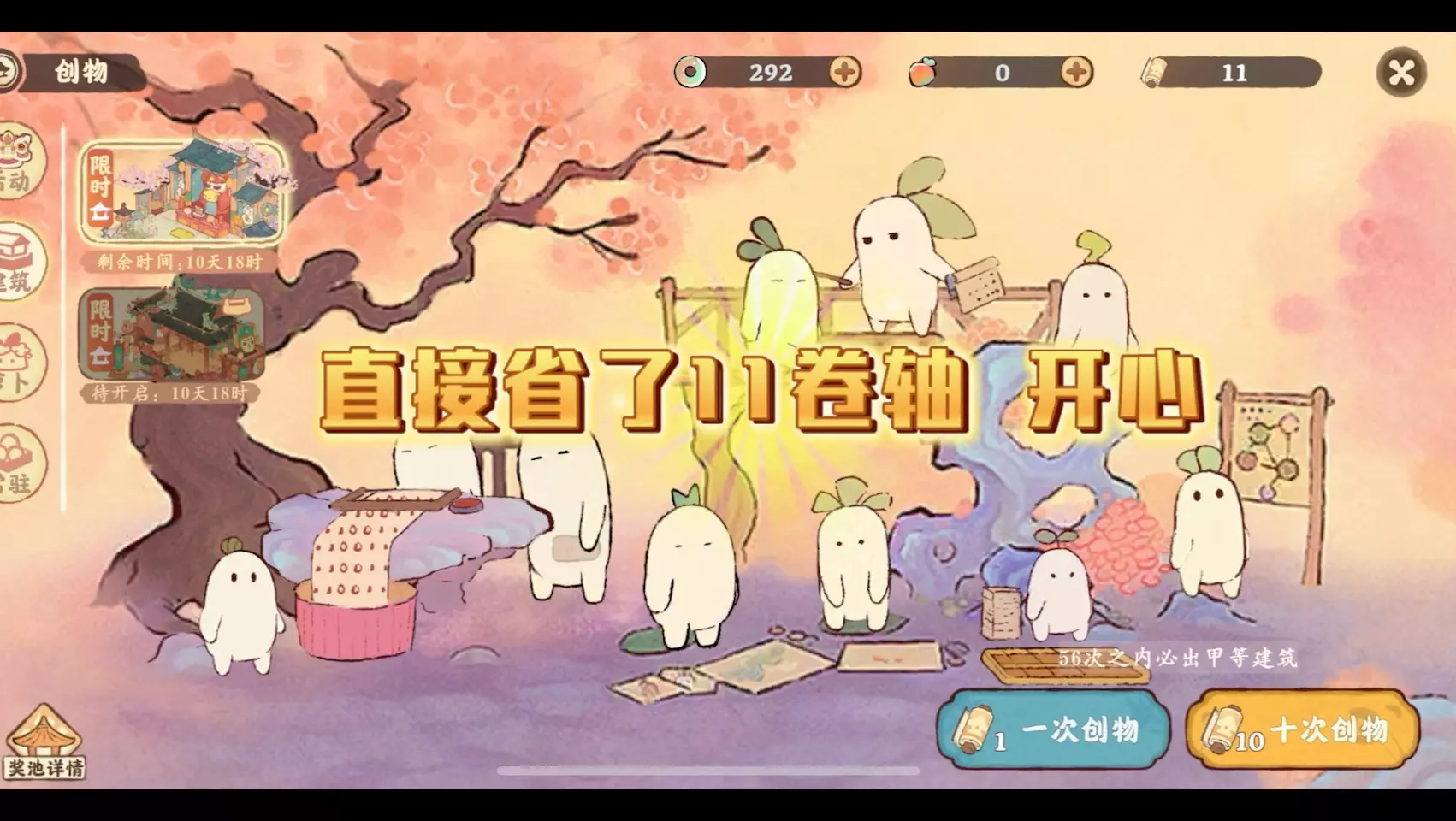 这是游戏《桃源深处有人家》的抽卡内容分享,博主进行了创物抽卡,抽卡后获得了多个建筑,博主用“良心发现”表达此次抽卡的惊喜,展示了抽卡前后的资源变化与抽卡结果。