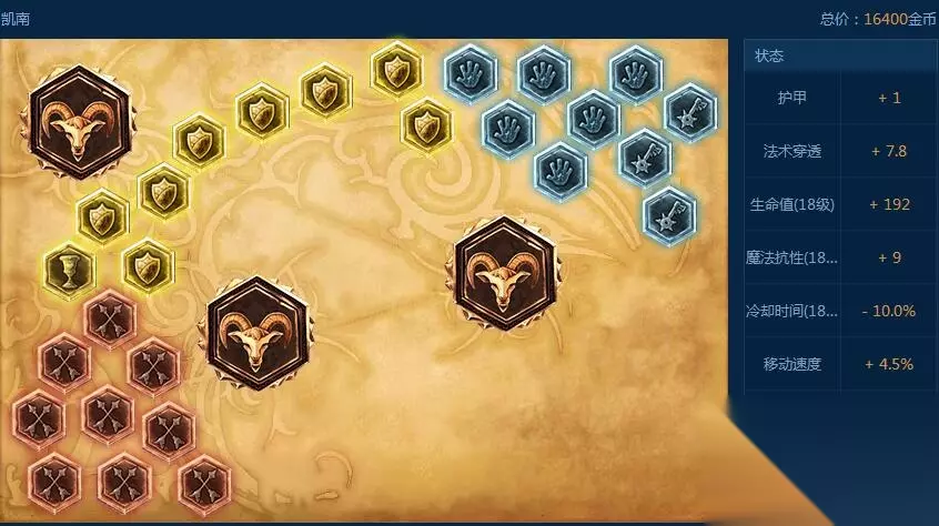 符文方面选择了红色9个法穿符文,黄色1个护甲8个成长生命值,蓝色6个成长减CD3个成长魔抗,至于大精华则是三个移动速度 这套符文和常规的符文相比就是精华上的区别,大精华的移动速度会让凯南的进场变的更轻松。但是损失掉的自然就是法强的加成了。