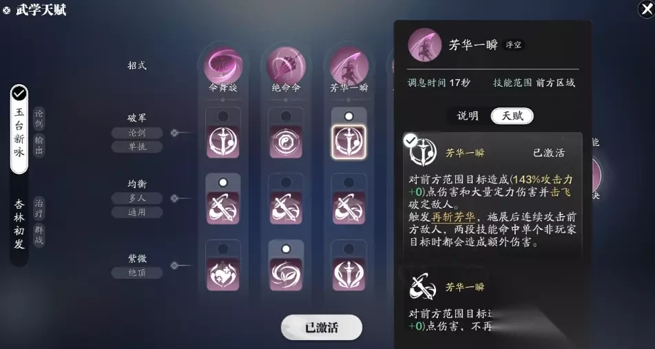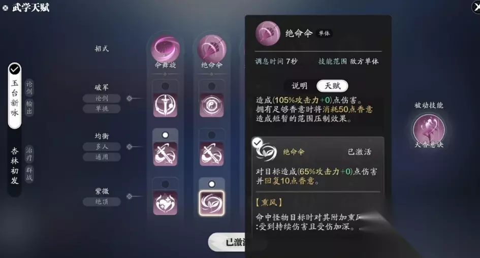 部分本中缺伤害的情况下,天香常常需要切剑进行补刀。比较好用的加点是23133,再将套路切到玉台新咏中。绝命伞可选紫薇这一类天赋,造成伤害的同时可进行香意的恢复。优势在于命中敌怪的时候,会通过熏风给其附加dot和易伤。玩家看到敌怪头顶出现小伞标志的时候,即可进行爆发了。舞旋可选择用均衡类天赋,它可对敌怪造成多段内功这一种类型的伤害。命中敌怪可造成百分之三十额外伤害,范围内仅有一个敌人的时候伤害还能增加。一瞬可选用破军类天赋,它可对一定范围敌怪造成高倍攻击和定力伤害。