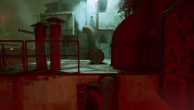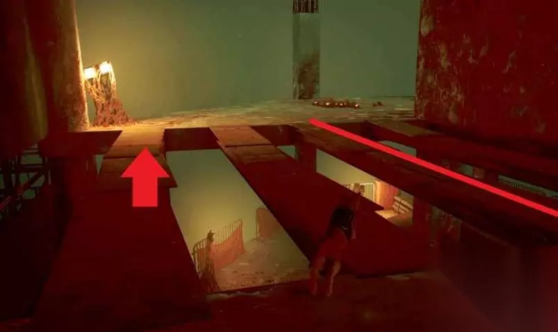 跳上起重机,继续穿过下一栋建筑。在这里,你需要跳到角落里的小脚手架上,然后与木板互动,将它推过来,这样你就可以越过脚手架,穿过通风口进入建筑物。