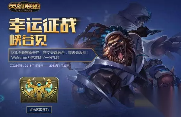LOL幸运征战皮肤领取地址: LOL幸运征战礼包领取方法: 使用WeGame启动英雄联盟,进入游戏就能获得四选一的皮肤。想要皮肤的玩家赶紧使用TGP登录英雄联盟然后在登录上面的地址去领取自己喜欢的皮肤吧!另外玩家们要注意这次1月活动的时间为2018年1月9日-2018年1月23日,将会持续到月底,玩家一定要在这个期间领取免费皮肤哦!