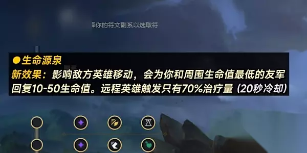 三、绿色符文页 1、生命源泉【新效果】:影响敌方英雄移动,会为你和周围生命值最低的友军回复10-50生命值。远程英雄触发只有70%治疗量(20秒冷却)