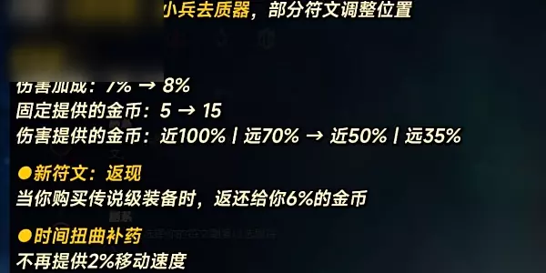 四、蓝色符文页: 1、移除:未来市场、小兵去质器,部分符文调整位置。 2、先攻:伤害加成:7%→8%,固定提供的金币:5→15,伤害提供的金币:近100%l远70%→近50%l远35% 3、返现(新符文):当你购买传说级装备时,返还给你6%的金币。 4、时间扭曲补药择:不再提供2%移动速度,立刻回复的生命值:30%→40%,现在饼干不会触发效果。 5、万事通(新符文):通过装备获得不同的属性时,每种类型的属性会为你提供1个层数。每层+1技能极速,当你到达5和10层时,分别获得10和25适应之力。