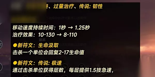 英雄联盟S14赛季符文数据调整介绍 一、黄色符文页: 1、移除:致命节奏、过量治疗、传说:韧性 2、迅捷步法:移动速度持续时间:1秒→→1.25秒治疗效果:10-130 →8-110 3、生命汲取(新符文):击杀一个单位会回复2-17生命值 4、传说:极速(新符文):通过击杀单位获得层数,每层提供1.5技急速,最多10层 5、砍倒:伤害加成:5-15%→8%,触发条件:敌人当前生命值>60%(比如601/1000)