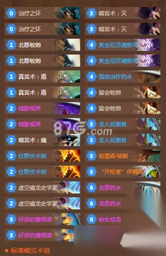 这套卡组的核心思路是杂糅多个体系,解场、控场、补充手牌一条龙。具体卡组如下: 1[真言术:盾]x21[北郡牧师]x2NaN[治疗之环]x22[狂野炎术师]x22[暗影视界]x22[虚空幽龙史学家]x22[暗言术:痛]x13[暗言术:灭]x23[好奇的萤根草]x24[宴会牧师]x24[奥金尼灵魂祭司]x24[强效治疗药水]x15[龙人侦测者]x25[哈里森·琼斯]x15[“开拓者”伊莉斯]x16[龙息药水]x28[始生幼龙]x2 单卡分析 1环+奥金尼灵魂祭师:这组合以前是牧师的传统手段,现在也能在4费阶段解掉快攻卡组的场面。环还能配合北郡牧师过牌,或者回复随从血量,避免被鱼死网破。 2强效治疗药水:这张卡很关键,4费就能回12点血量,对快攻卡组特别有用。慢速卡组血量压力不大,可以用来奶随从,避免被对方处理。有时候打疲劳,这张卡可能是压死对方的最后一根稻草。 3哈里斯琼斯:现在武器卡组挺多,猎人、萨满、战士、盗贼、法师都有武器,有些武器威胁很大,比如法师的麦迪文武器能压死慢速卡组。哈里斯琼斯能很好地针对武器卡组。 4开拓者伊利斯:补充后期手牌,慢速卡组需要不停过牌,利用龙体系补充手牌,但吃乱斗后可能没牌。暗影视界配合开拓者能获得大量卡牌,支持我们耗下去。 卡组优缺点 1优点:结合了多个体系,解场、控场、补充手牌都能兼顾,对任何职业都挺有效,尤其快攻卡组,前期解场卡牌多,苟住后期就容易赢。 2缺点:杂糅太多体系,容易遇到尴尬局面,比如没龙、没环,或者关键卡牌没来。大后期卡组(如青玉德)也头疼,不可能无限处理大随从。 对战分析 1VS快攻:先发北郡牧师控制场面,狂野炎术师+盾处理前期随从,留牌主要考虑这几个点:北郡、狂野炎术师、盾。 2VS中速:中速卡组比较好打,偷牌、解场、龙体系控制场面,只要控制住节奏,赢只是时间问题。留牌:虚空史学家、好奇的萤根草、龙,后手根据职业补充法术或随从。 3VS任务贼:任务贼是特例,要站住场面抢血量,龙息术清理场面时机要抓准。掌握这两点就好打,否则比较难。留牌:狂野炎术师、好奇的萤根草、4费随从,保持随从顺畅和场面压力。 4VS慢速卡组:慢速卡组考验持续压制能力,不能给对方好节奏。如果是任务战,要阻拦对方任务速度,因为对方每回合的开炮威胁很大。留牌:虚空史学家、好奇的萤根草、龙。 这套卡组娱乐性很高,瓦娘直播里玩得挺嗨,大家可以去试试。如果想知道更多炉石传说资讯,可以去87G炉石传说专区看看。 话说回来,这套卡组虽然杂糅了多个体系,但确实挺有意思的,强度也不差。不过玩起来需要灵活调整,毕竟几个体系的关键卡牌没来时,场面会挺尴尬。大后期卡组也头疼,毕竟不可能无限处理大随从。总的来说,这套卡组适合喜欢探索不同体系的玩家,强度和娱乐性都在线。