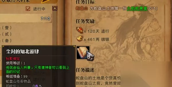 火焰蛇果宴隐藏任务: 当任务要你去逆龙坑,自动寻路到目的地之后使用NPC给你的酒,这时就会出现新的隐藏任务 接取任务,任务需要一个火焰蛇果宴,放一边,继续主线任务 注意,接任务要速度,土地公公会很快消失,消失了就放弃主线任务再接,接取以后继续做主线到蛇窟时,先不要进去,在门口接取一个每日修行任务,完成以后可以获得火焰蛇果一枚。 当主线任务要你进入蛇窟,传送门口孙小云有个任务,收集蛇果,进去采集就行了。(此任务为每日任务,每天完成一次,所以每次只有一个火焰蛇果) 出来之后和孙小云对话把任务交了,就会得到一个火焰蛇果 有了火焰蛇果,也有了需要火焰蛇果宴的任务,这个时候就需要把火焰蛇果变成火焰蛇果宴了 进入水凉村战鼓,干掉最后BOSS,会出现一个NPC,一个新的隐藏任务,接取,此任务是需要25个火焰蛇果,任务完成之后的奖励物品为火焰蛇果宴。