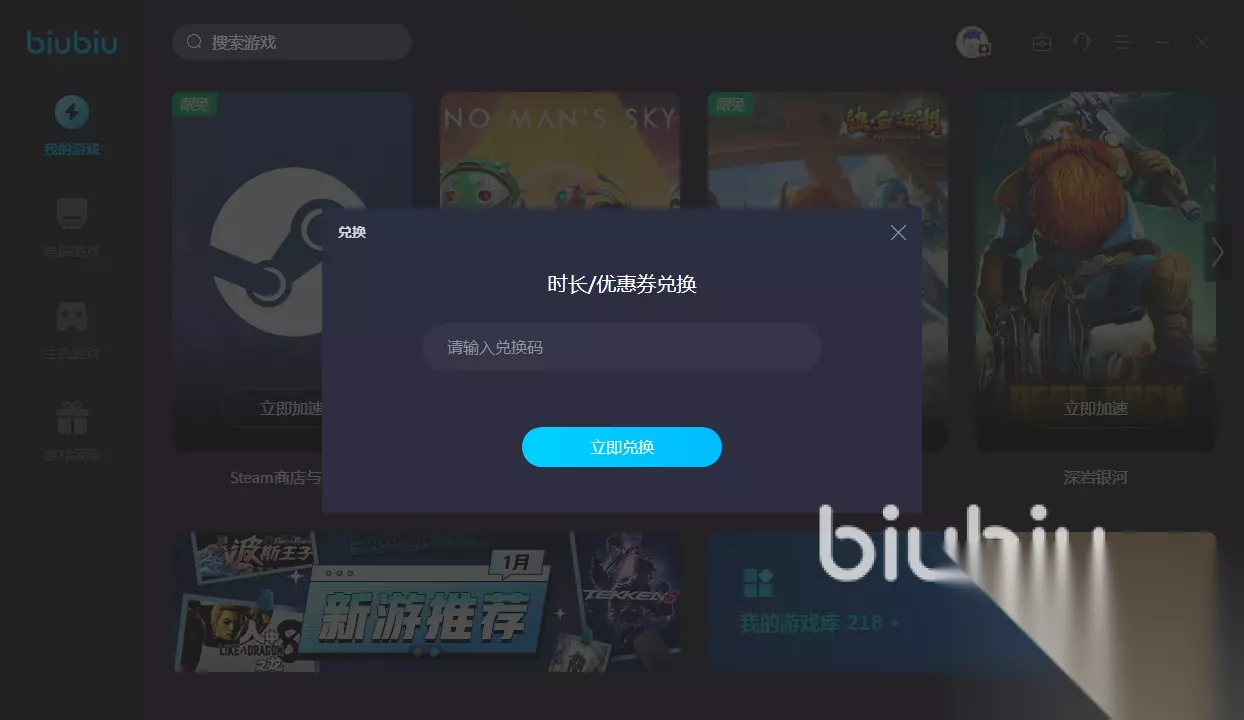 使用biubiu不需要大家进行各种复杂的设定,只要输入游戏名称,找到要加速的选项后,点击添加进列表里,随时想要在这里就能打开进行加速,实现一键操作。要想加速需要成为会员,但是现在推出了免费试用福利,如果是新注册的账号,可直接登录进来使用,会赠送24小时加速时间感受效果。还有一项更重要的福利,是每一个账号都能够使用的,打开兑换窗口后,将兑换码【biubiu不卡顿】输入进去,就能够获得三天加速时间。注意每个账号只能兑换一次,而且要是小写,不然无法使用成功。