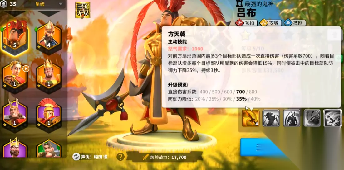 PVP 里对面都是玩家,会针对性集火吕布,所以坦度重点是 “扛住爆发伤害”,减少被秒的概率。 核心套装:龙鳞套装(头盔 + 胸甲 + 护腿)+ 磐石套装(武器 + 副手) 龙鳞套是 PVP 防御天花板:2 件套加 20% 防御值,3 件套加 15%“伤害减免”(所有伤害都减 15%,包括技能伤害);磐石套更狠,2 件套加 10% 韧性(减少被暴击的概率 + 暴击伤害),3 件套加 “受到暴击时减伤 30%”—— 要知道很多武将靠暴击打爆发,磐石套直接克制这点。 关键细节:如果觉得输出不够,武器可以换成 “方天画戟”(吕布专属,加暴击伤害),但副手一定要带磐石套的 “护手”,保证韧性和暴击减伤,别贪输出丢了坦度。 二、天赋加点:别全点输出!防御分支是 “坦度关键” 很多人玩吕布,天赋全点 “勇武”(输出分支),结果脆到离谱。想肉起来,天赋必须 “偏防御,兼顾续航”,具体加点顺序记好: 1. 优先点满 “防御分支” 核心天赋