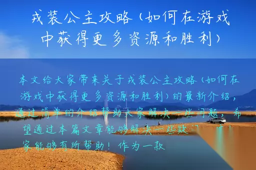 本文给大家带来关于戎装公主攻略(如何在游戏中获得更多资源和胜利)的最新介绍,通过简单的介绍帮助大家解决一些问题,希望通过本篇文章能够解决一些疑问,对大家能够有所帮助! 作为一款非常受欢迎的手机游戏,戎装公主吸引了众多玩家的关注。在游戏中,你需要扮演一位公主,带领你的军队征战四方,赢得胜利。然而,要想在戎装公主中获得更多的资源和胜利并不容易。在本篇文章中,我们将为你提供一些有用的攻略,帮助你在游戏中获得更多的资源和胜利。