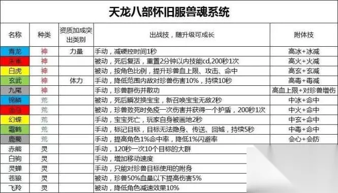 附体搭配思路详解(天龙八部怀旧服附体怎么选) 昨天讲了基本的魂玉特点,今天和大家简单分析一下不同门派如何选择不同的附体技能,大家结合自己的玩法进行选择。 首先感谢内测服玩家夜色提供的副本素材,以及半城烟沙区各位玩家的积极分析,讨论!!! 下面正式开始: 兽魂一共有15种,分为神,荒,灵三个等级。例如,青龙兽魂属于神级,力量珍兽对其技能加成最大。如果一只珍兽装备了青龙兽魂,出战时会提供一个手动技能,附体时会给主人提供350冰属性和125冰减抗。