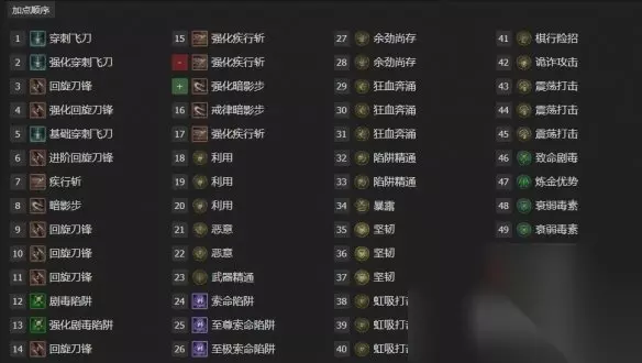 核心:回旋刀锋+坚韧+虹吸打击 敏捷:暗影步+疾行斩+震荡打击+棋行险招+诡诈攻击+武器精通 诡诈:剧毒陷阱