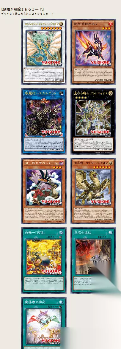 限制解除: 古代妖精龙 转生炎兽 羚羊 锁龙蛇-骷髅四面鬼 星守之骑士 托勒密 黑羽-隐身蓑之斯蒂姆 雷鸟龙-雷龙 炎舞-「天玑」 天底的使徒 魔导书的神判