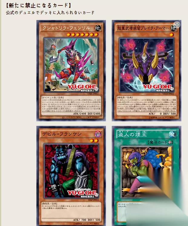 游戏王2023年7月禁卡表调整了哪些卡 新禁止: 制限⇒禁止 俱舍怒威族·芬里尔狼 恶魔科学怪人 無制限⇒禁止 超重武者装留 破坏铠 盗贼的烟玉