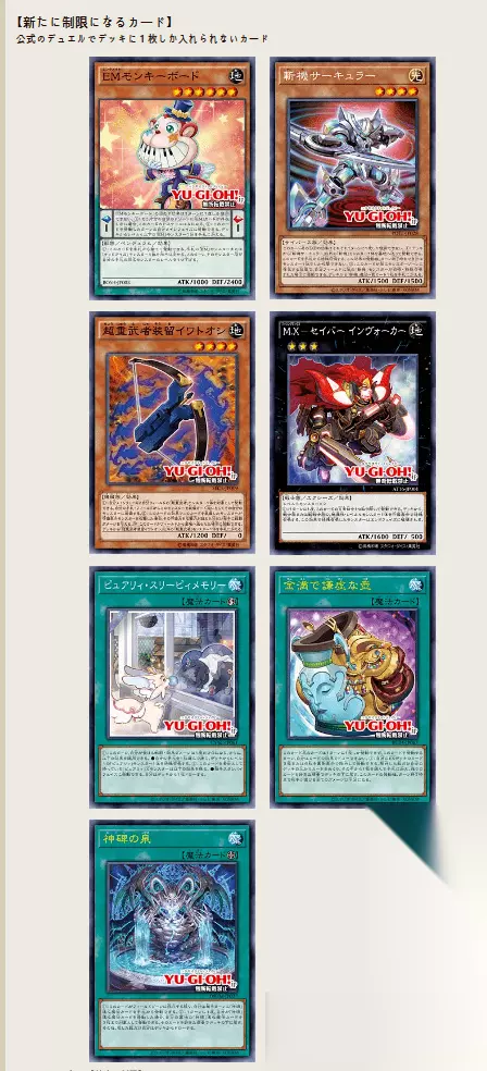 新限制: 禁止⇒制限 娱乐伙伴 琴键猴 失X-剑士 招来者 無制限⇒制限 斩机 圆武 超重武者装留 岩融 纯爱妖精瞌睡回忆 準制限⇒制限 神碑之泉 金满而谦虚之壶